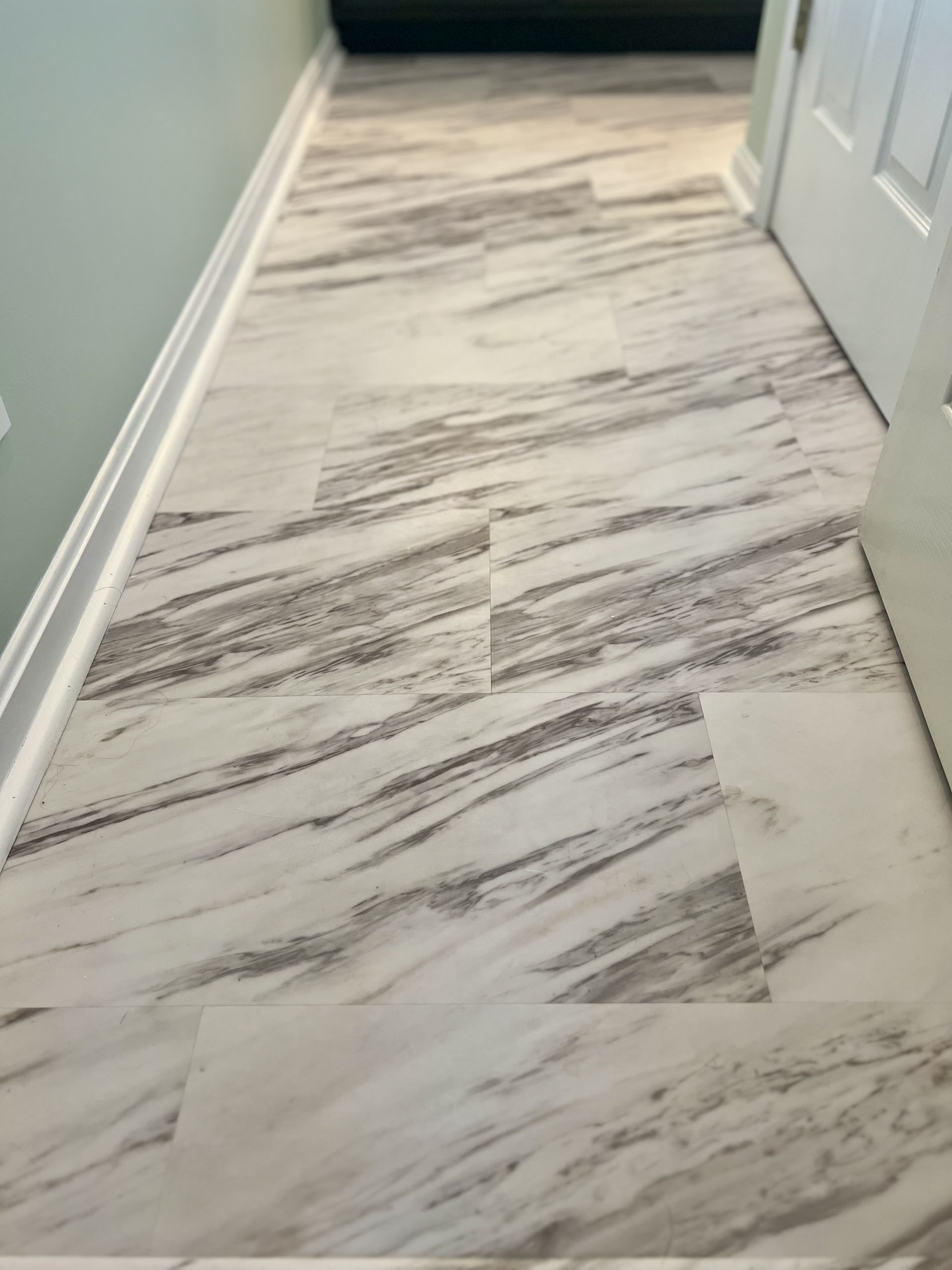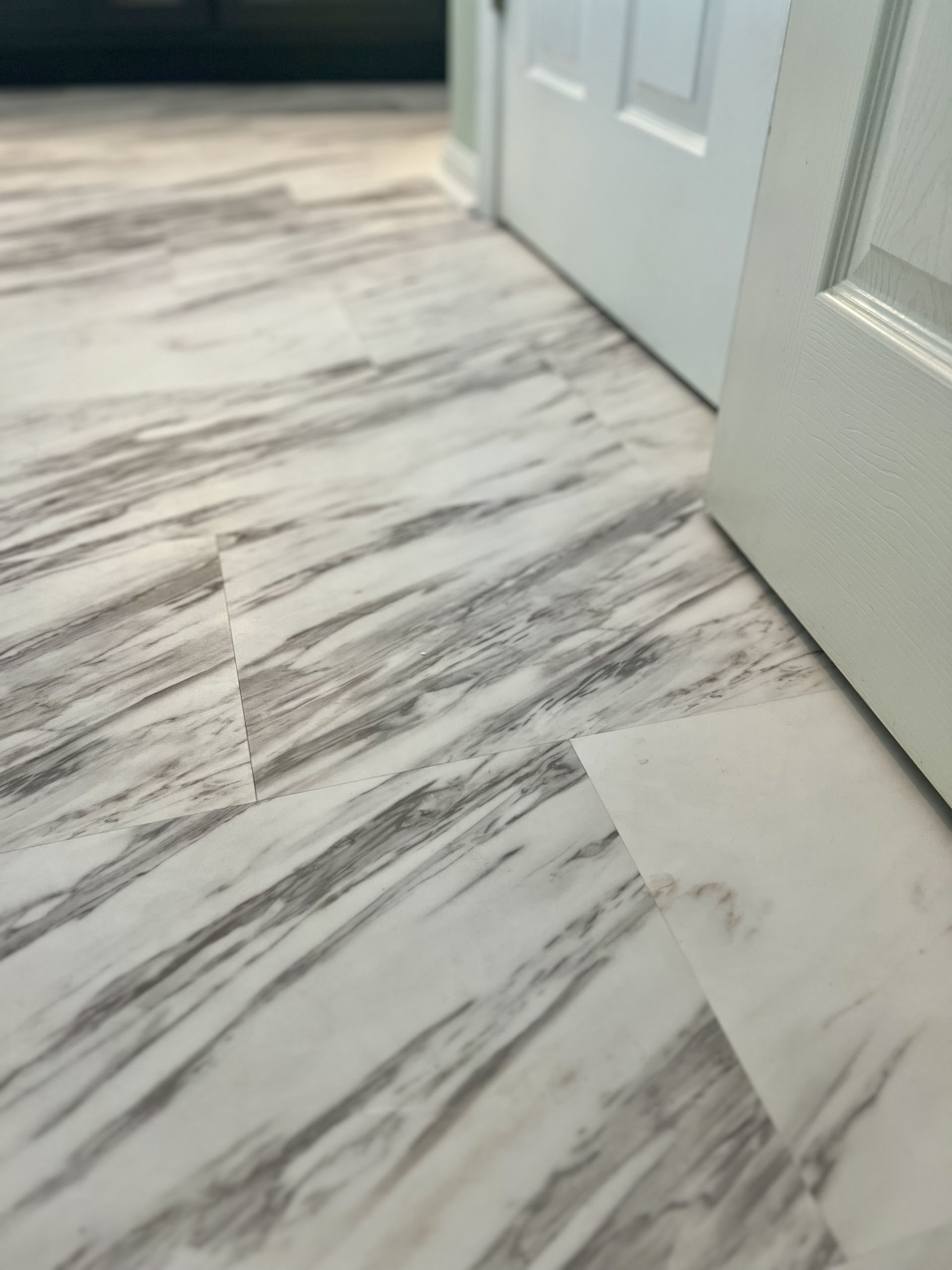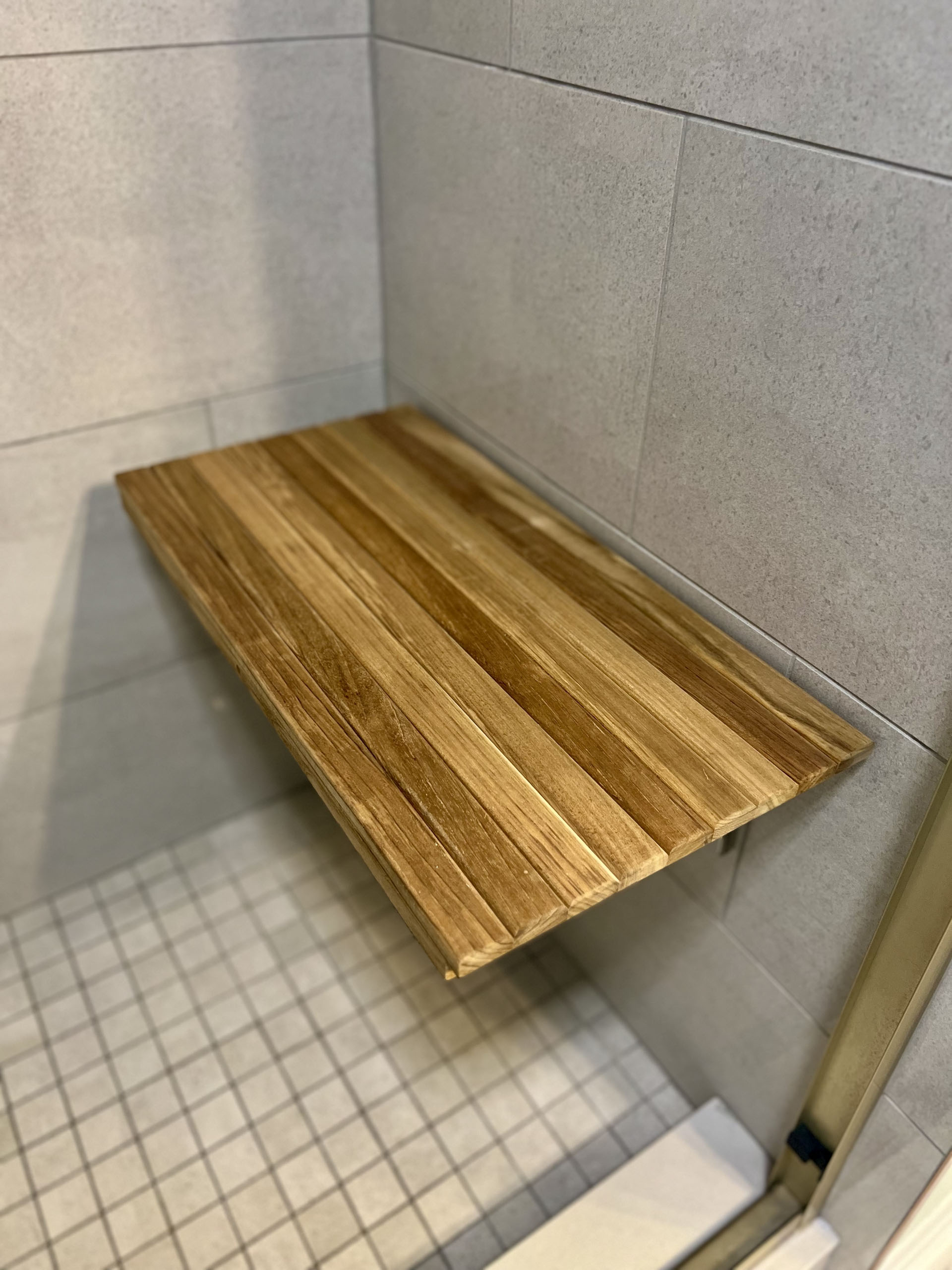 Maeser converted their tub to a shower, added the seat, and installed a luxury vinyl plank tile.