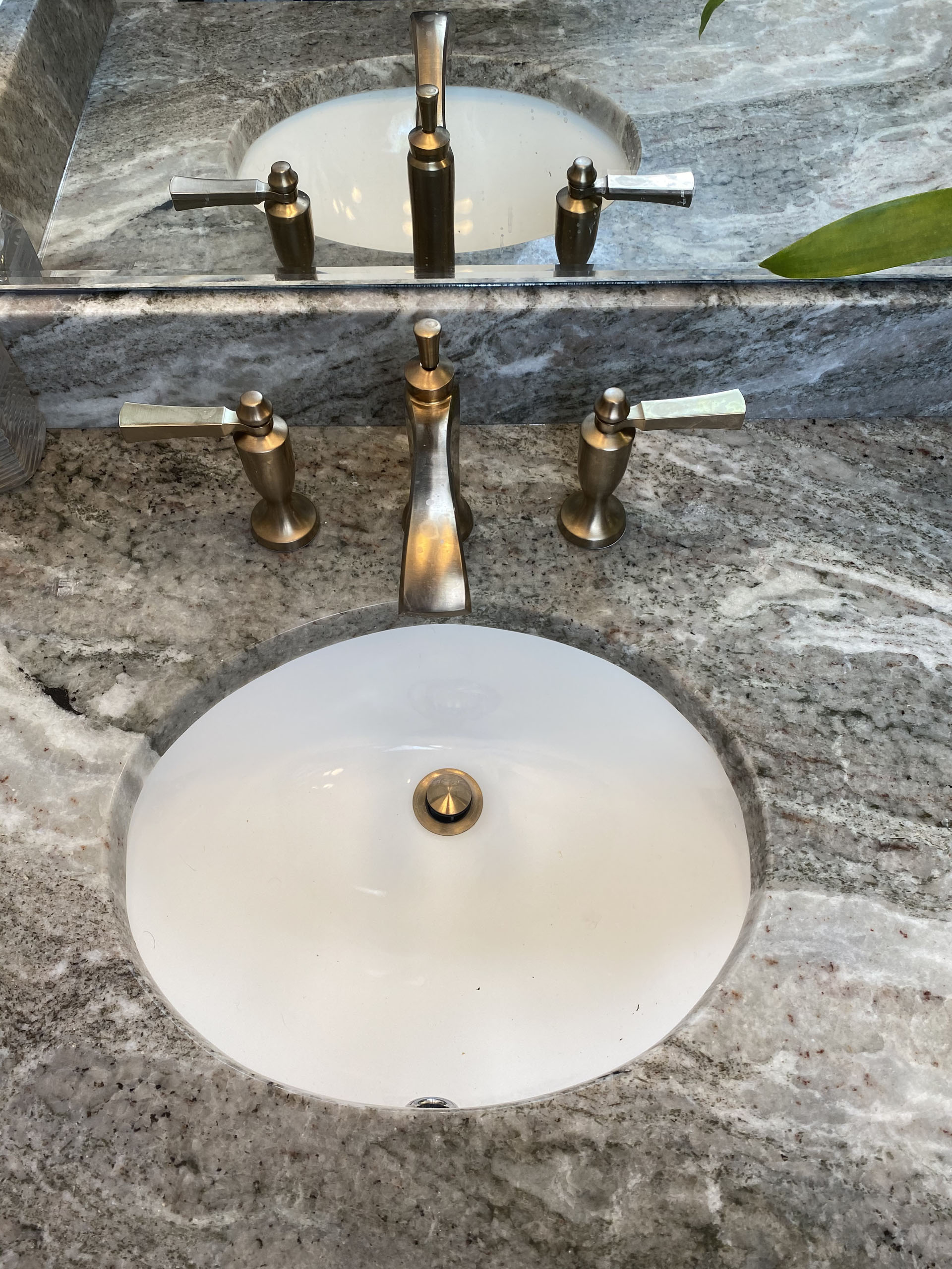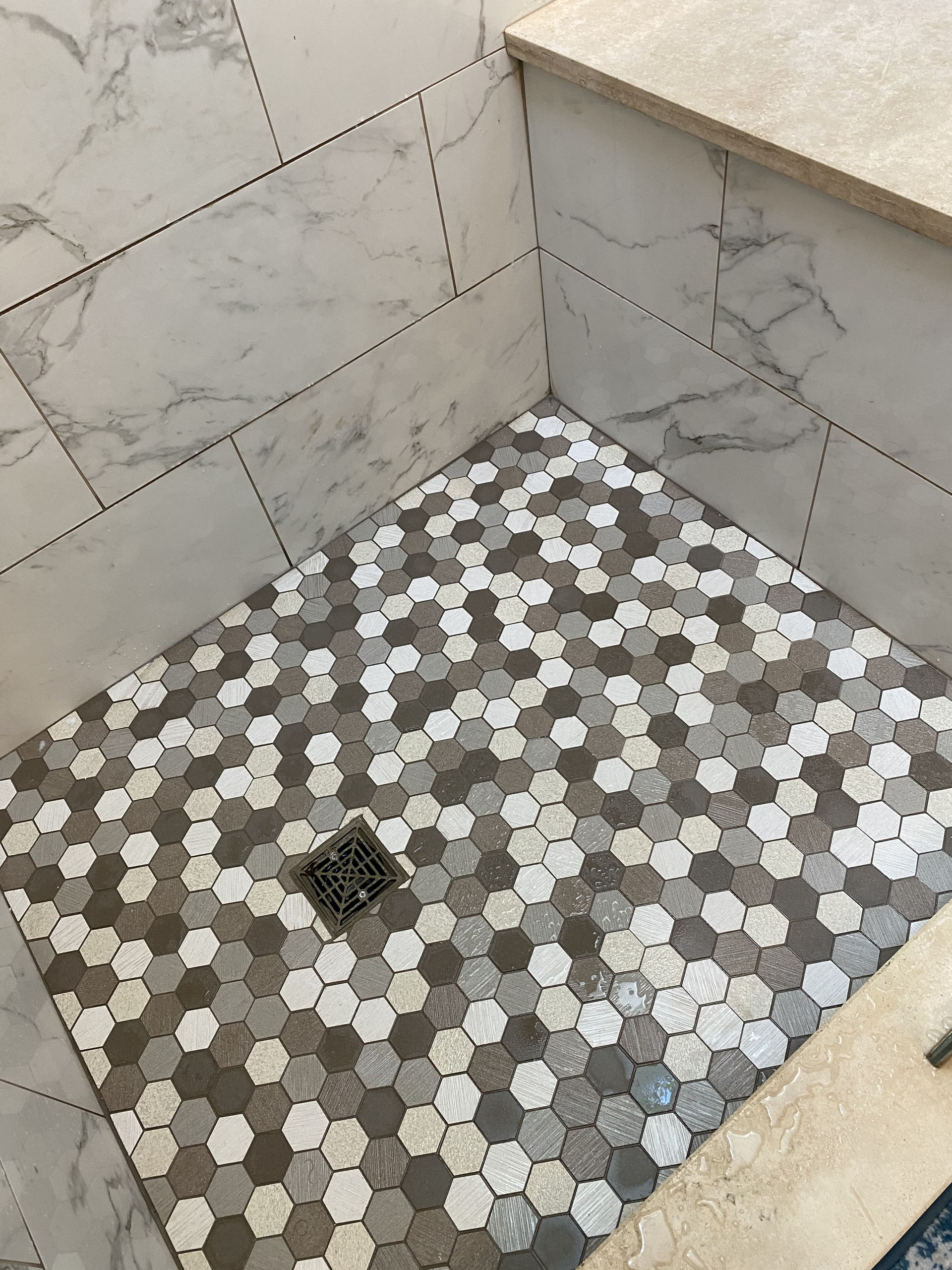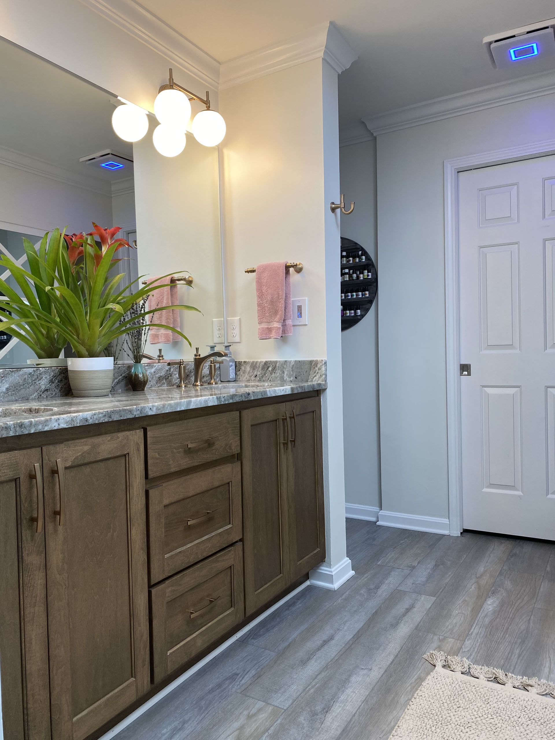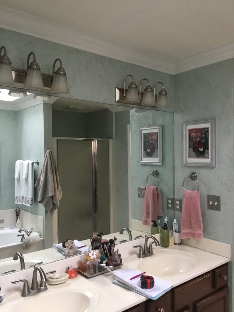 Maeser installed a luxurious custom-tiled shower with a fully tiled bench. We framed up the front of their old shower and added mirrored doors with full shelving inside. Then, we replaced the vanity area with a custom cabinet, granite countertops, and a new mirror and lights.