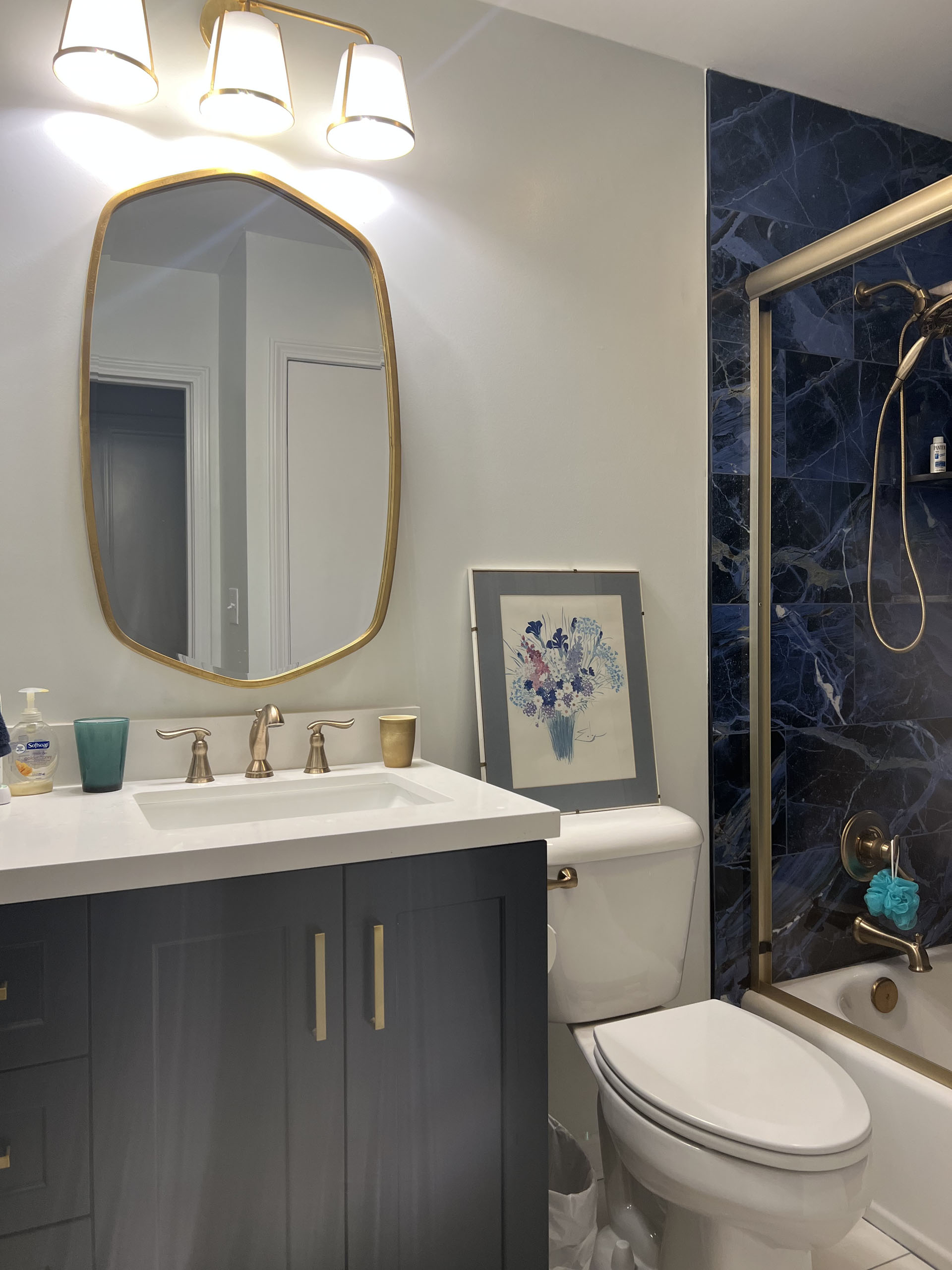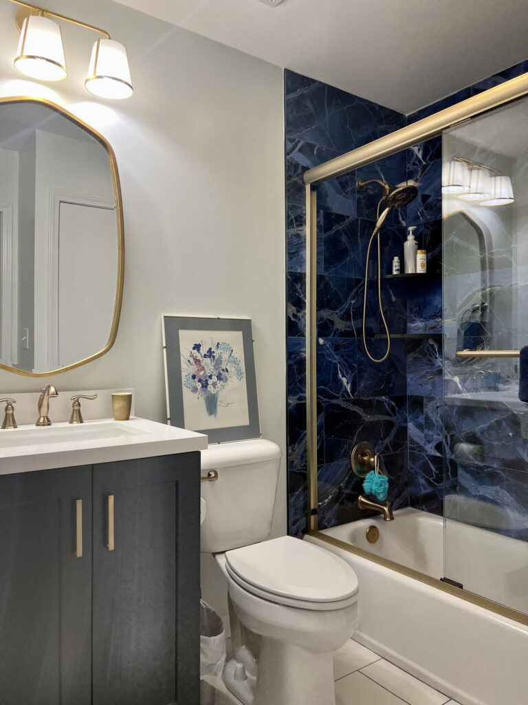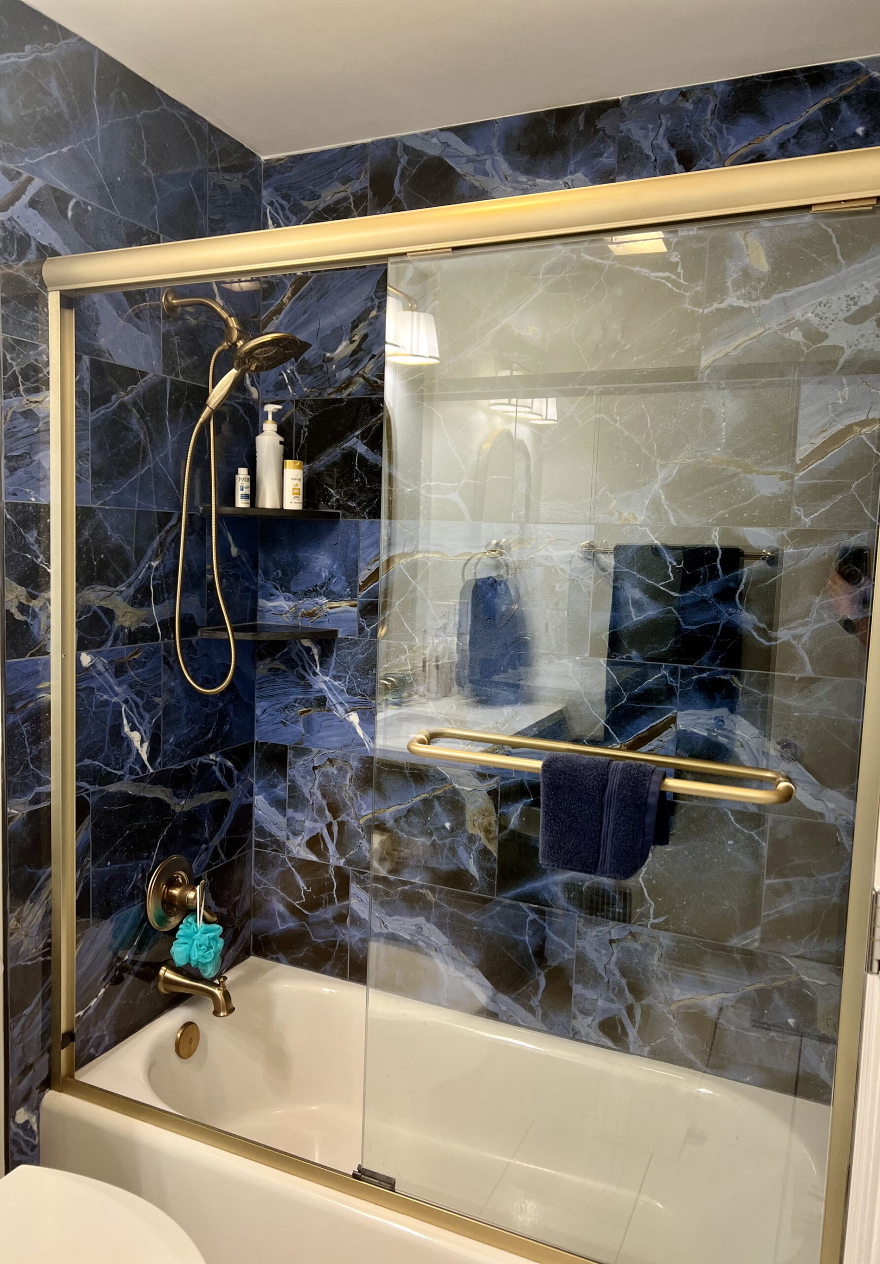 We completely gutted the bathroom to the studs. The house was from the sixties, so they wanted a clean yet dramatic look to freshen it up. We replaced the floor with a semi-polished tile with a bright blue Power Grout, and installed new faucets and a steel tub. We tiled to the ceiling with a striking electric blue porcelain marble tile. We installed a new shower door, commode, and full vanity with new mirror and lights.