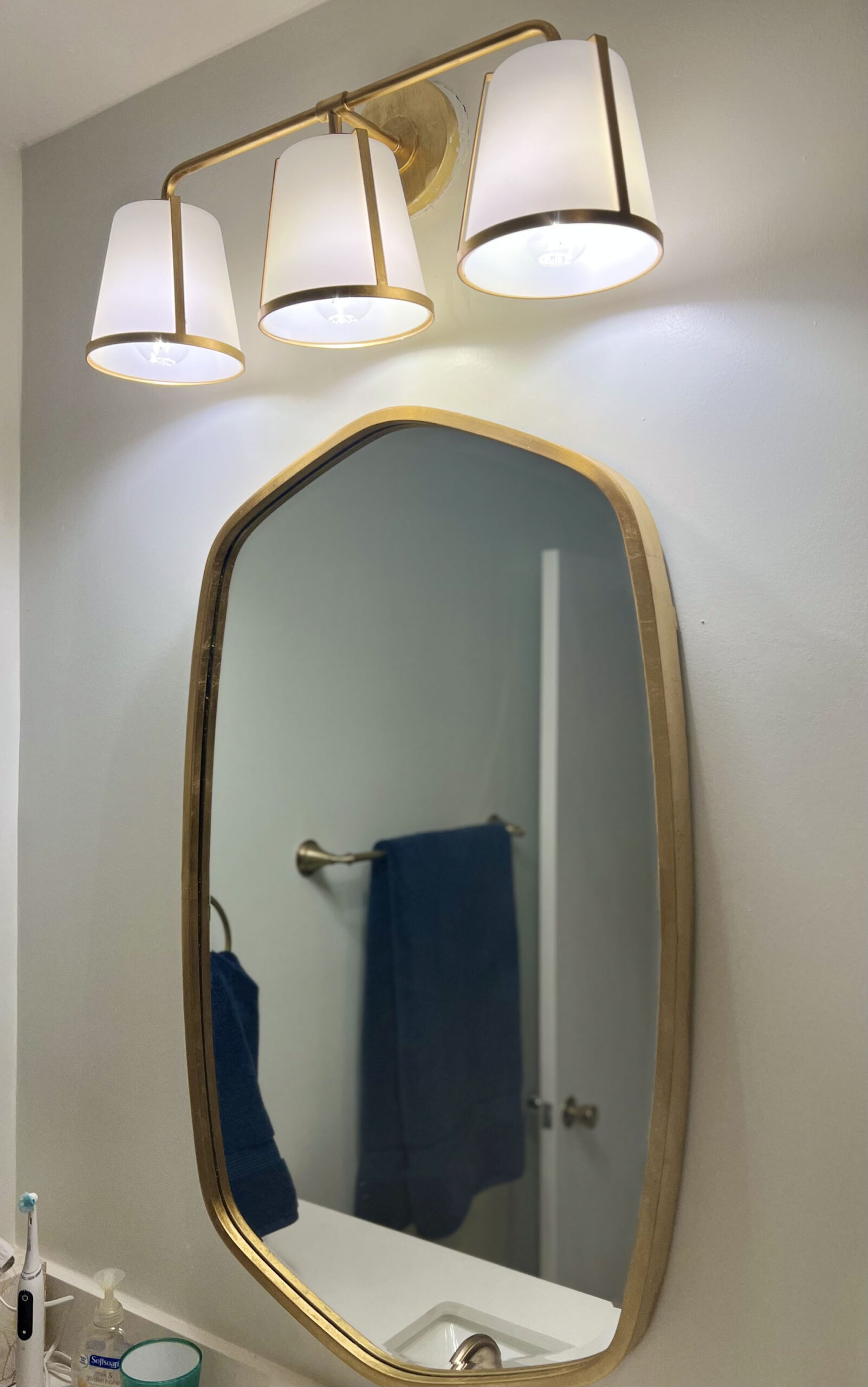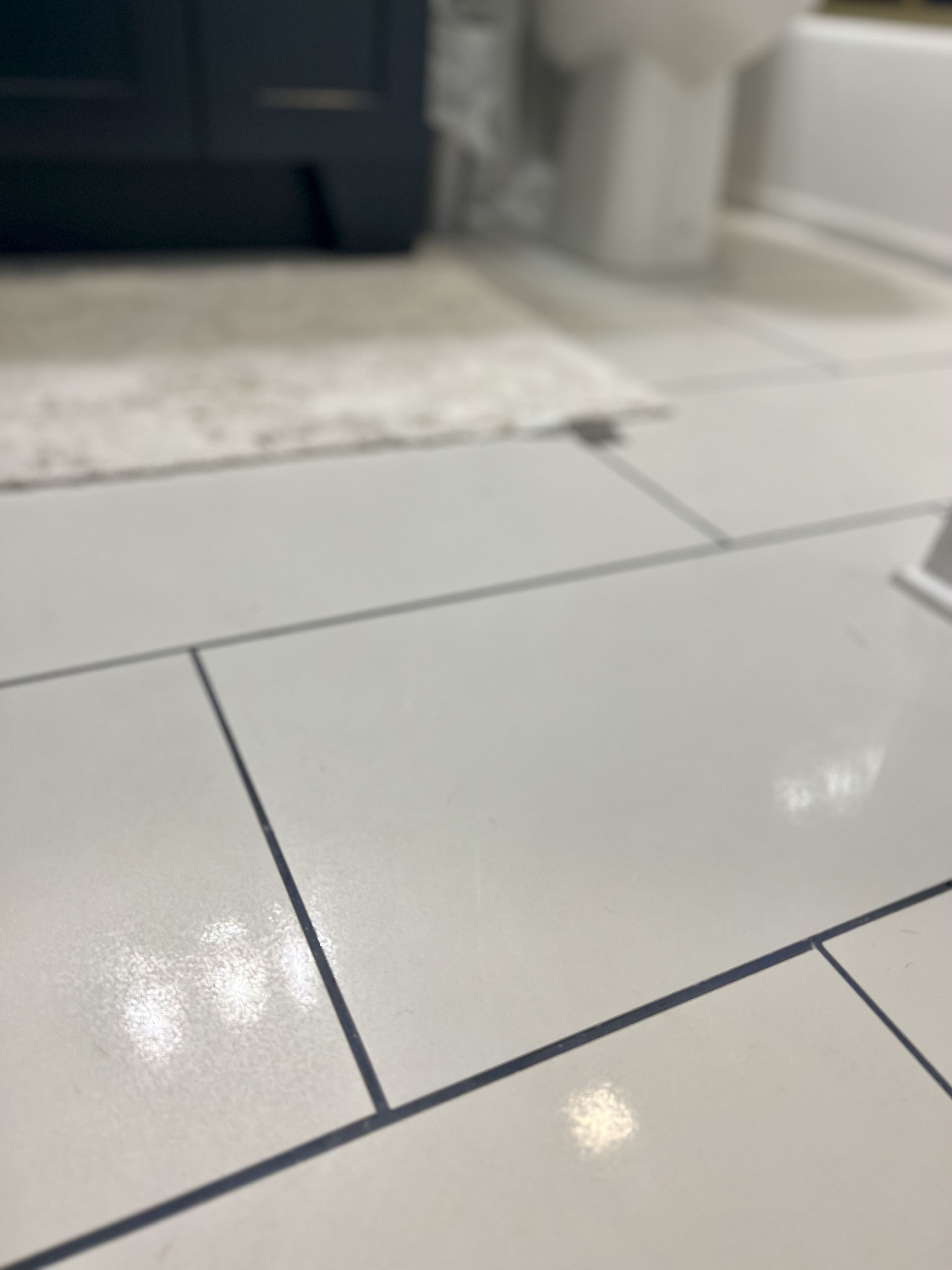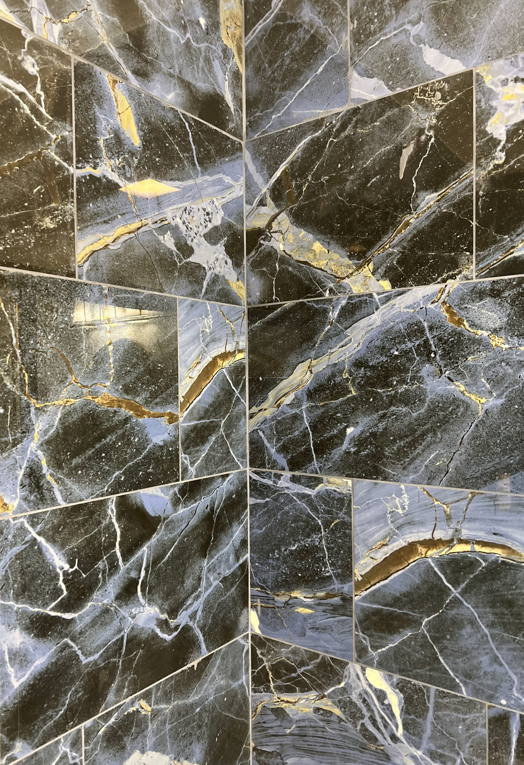 We completely gutted the bathroom to the studs. The house was from the sixties, so they wanted a clean yet dramatic look to freshen it up. We replaced the floor with a semi-polished tile with a bright blue Power Grout, and installed new faucets and a steel tub. We tiled to the ceiling with a striking electric blue porcelain marble tile. We installed a new shower door, commode, and full vanity with new mirror and lights.