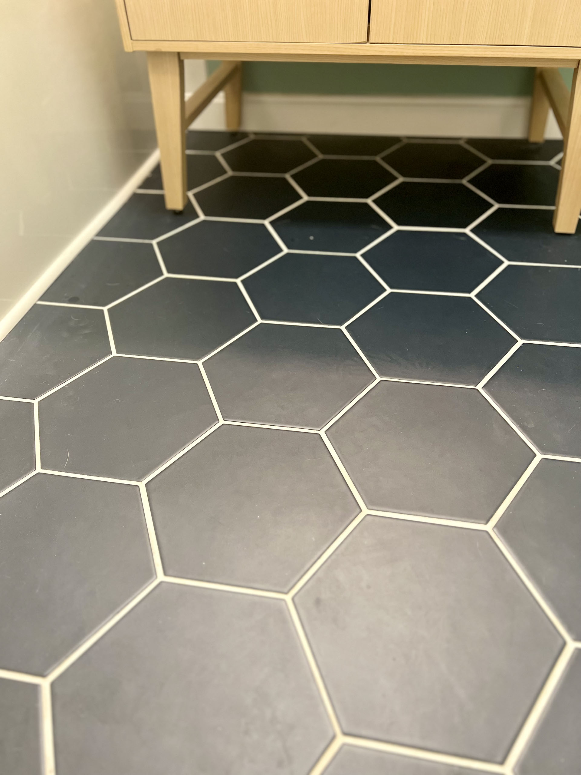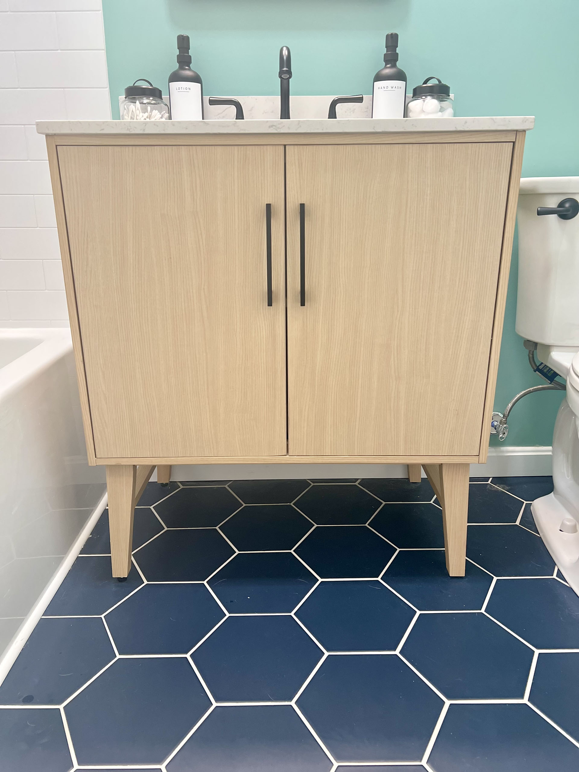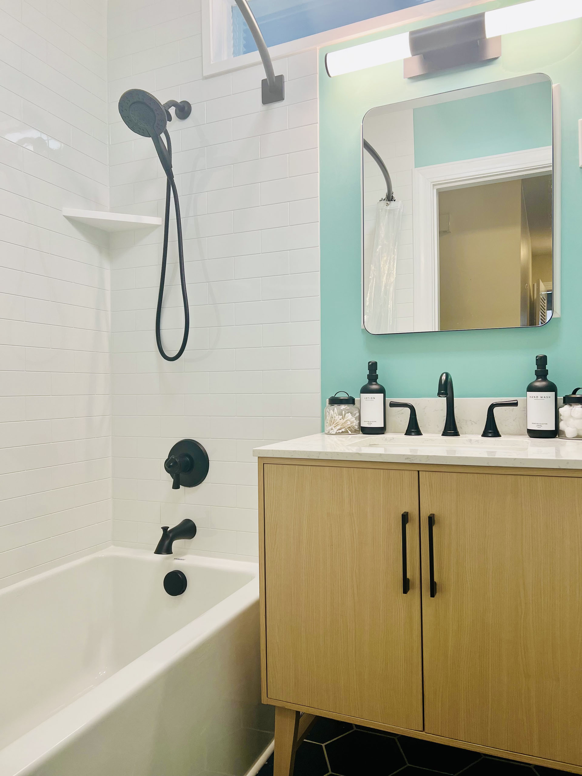 Maeser gutted the bathroom to the studs, creating an elegant mid-century vibe. We installed a deep acrylic soaking tub with solid panels up to the ceiling in a 3x8 high gloss subway pattern. We added a new mid-century vanity and a mirror with a recessed medicine cabinet. We added a new light fixture and exhaust fan that vented out of the house and tiled the floor with a navy-blue hex floor tile.